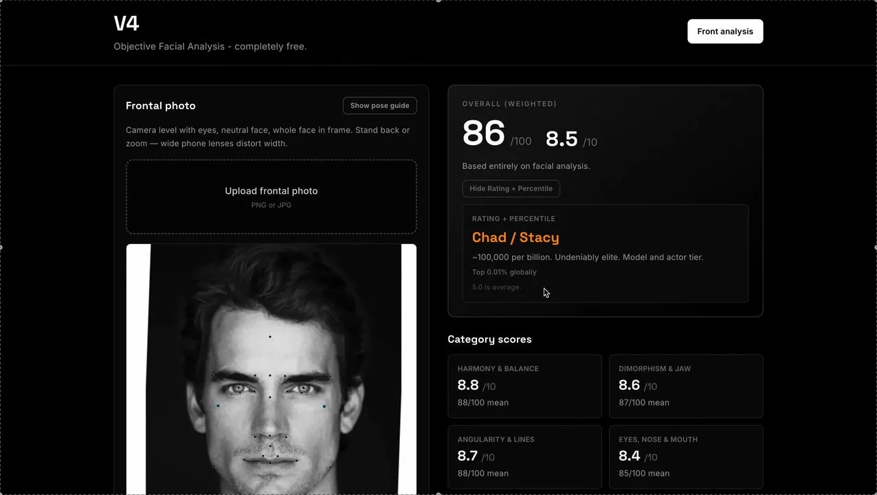 Was bored the other day so figured I would give one of these a shot, uses a local mediapipe model for landmarks + some ratios I pulled off of various forums and studies. Purely bone/math/ratio based, I may implement features later such as eye color, skin tone, hair, skin texture, acne, etc.