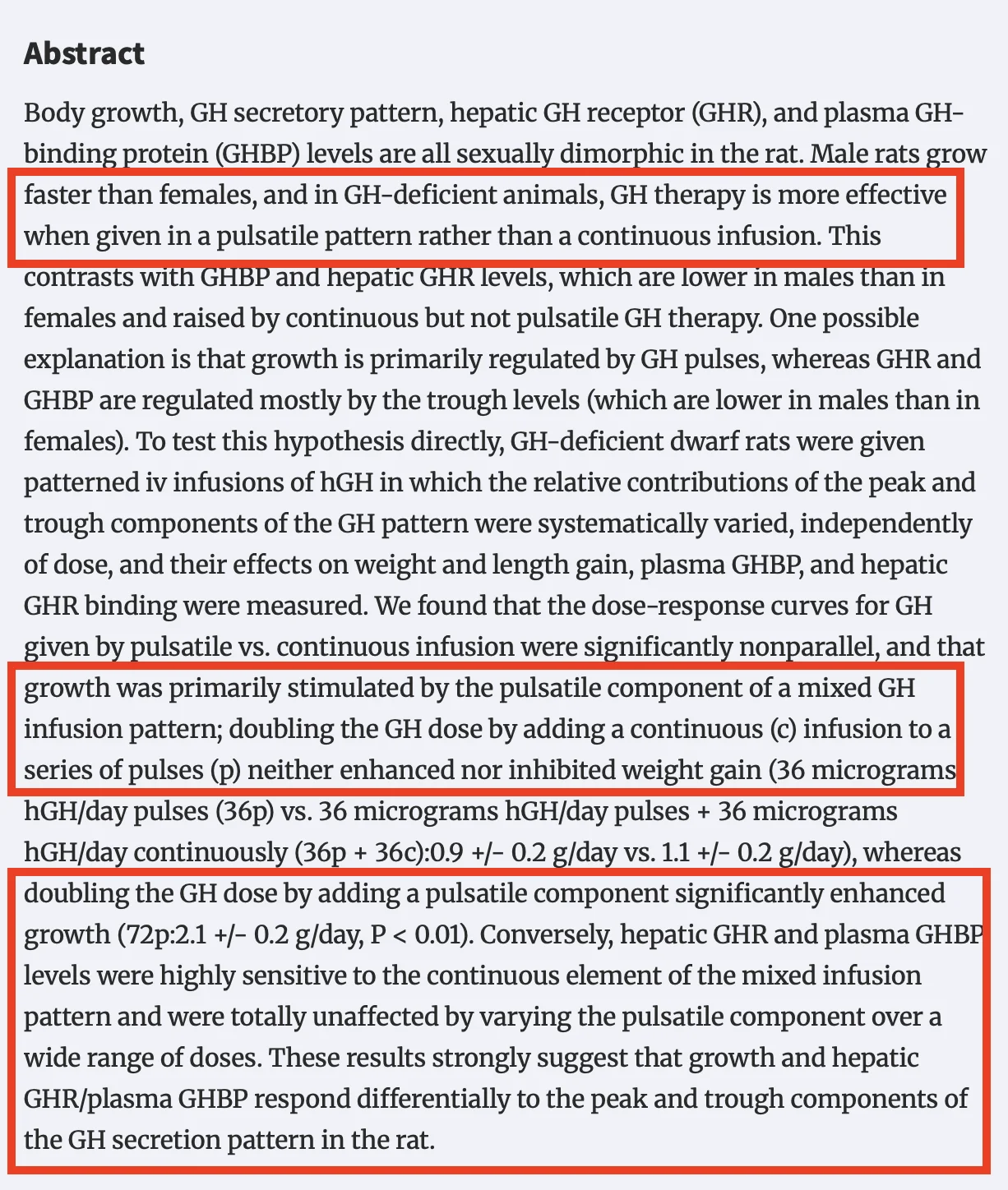 TLDR: This shows that pulsatile GH is much more effective for longitudinal growth etc. When pulsatile GH infusions were added to the continuous group, growth increased a ton however when continuous GH was added on top of pulsatile GH infusions there was no extra growth even when added on top/doubled dose.