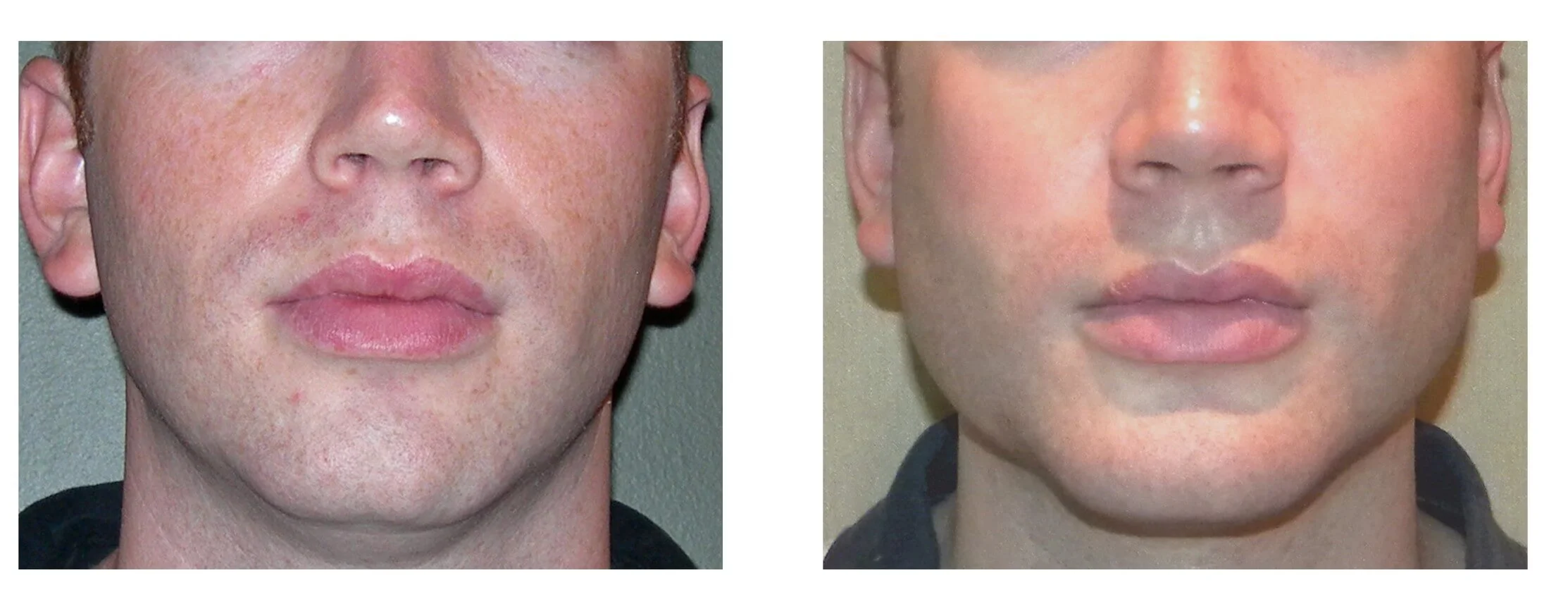 Implants can't increase the width of the mandible body like above, at least effectively. Wrap around implants often look obvious and uncanny: