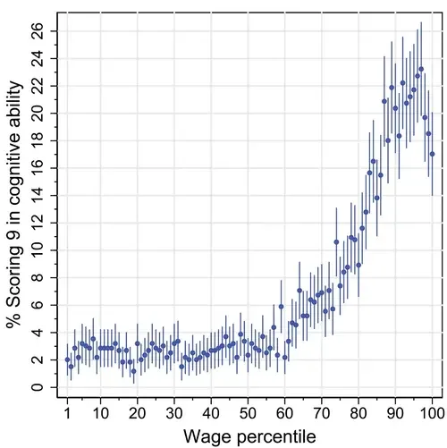 You will see that once the wage percentile reaches 95%, IQ starts to plateau and even begins to dip. [remember, data from almost 60,000 men, so no coping that this dip is not super correlative, this would only be