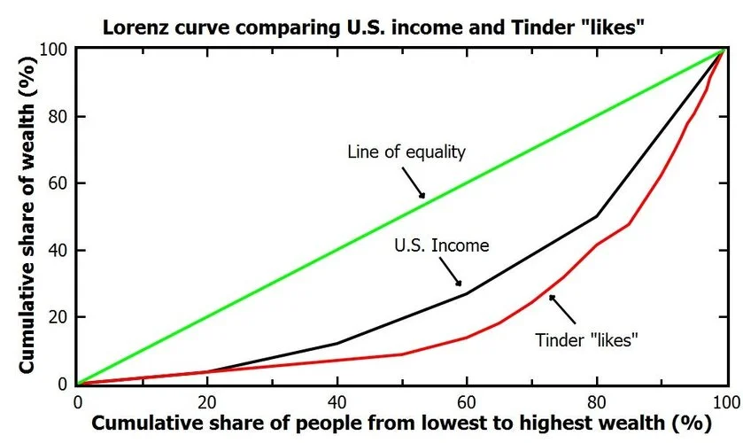 not to be confused with US NETWORTH. It would look different as the top 1% of americans own 30% of the networth, for tinder it's top 1% gets 20% of the tinder likes.