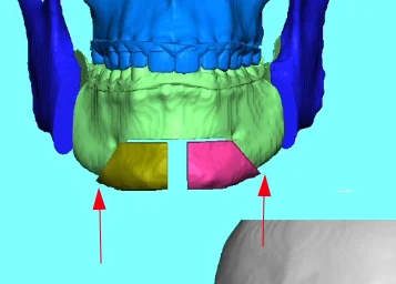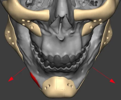 Importantly it also allows chin width to be expanded (with a split genioplasty) without creating a step-off. As you can see with a normal split genioplasty this happens between the mandible body and the chin segment: