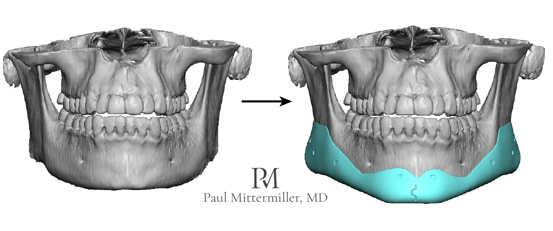 It is a purely surgical alternative to the alternate approach, MSDO. The midline osteotomy is a procedure where a cut is made down the center of the mandible through the chin and then the whole jaw is widened, slightly torquing the TMJs. This increases chin width, mandible body width, lower aveolar process width and bigonial width.