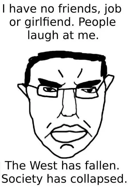 hey are similar to a chudjak meme where some low IQ low tier normie white guy was bullied by his peers, had no loyal friends, KHHV, browses an incel/looksmax forum, turns into an sfcel neonazi groyper that utters "Duh west has fallen, society will collapse, its over, race mixers are low iq" fucking idiot