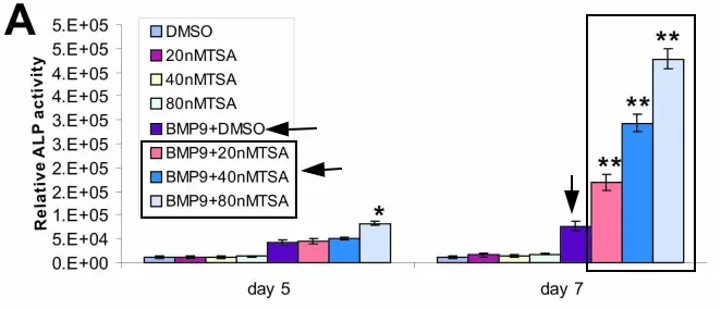In a comparison of ALP levels (An enzyme essential for bone mineralization and growth, acting as a key marker of bone-forming cell activity), Trichostatin A (HDAC inhibitor) significantly increased expression levels: