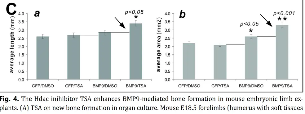 One study on BMP-9 (highly chondrogenic [cartilage forming] and osteogenic [bone forming] endogenous protein) found that simultaneous application with a pan-HDAC inhibitor increased the growth by a significant amount to the point where it made BMP-9 on its own look insignificant.